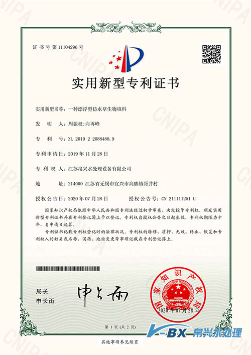專利證書-仿水草生物填料
